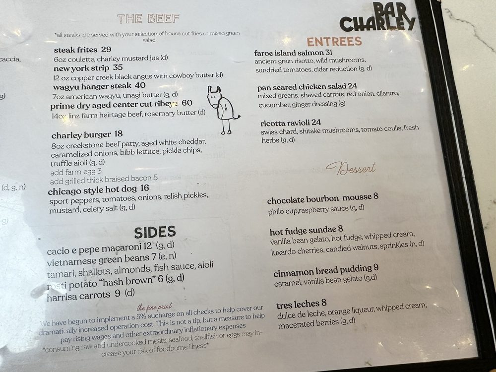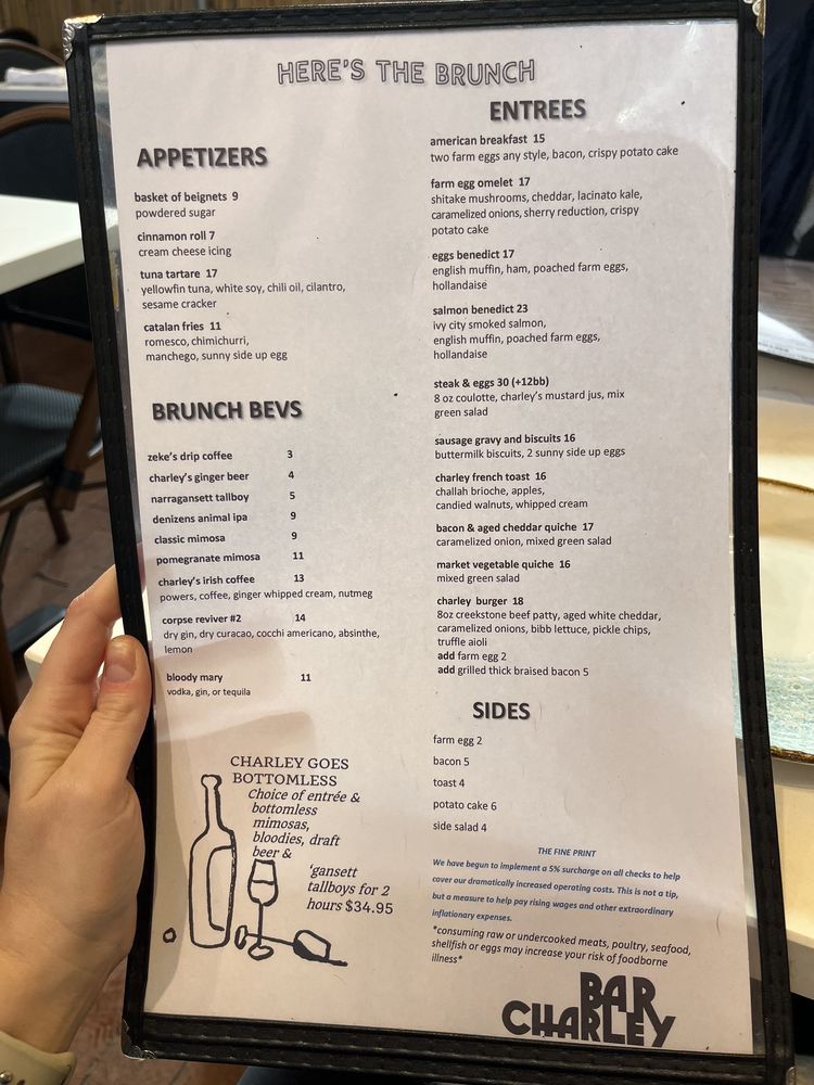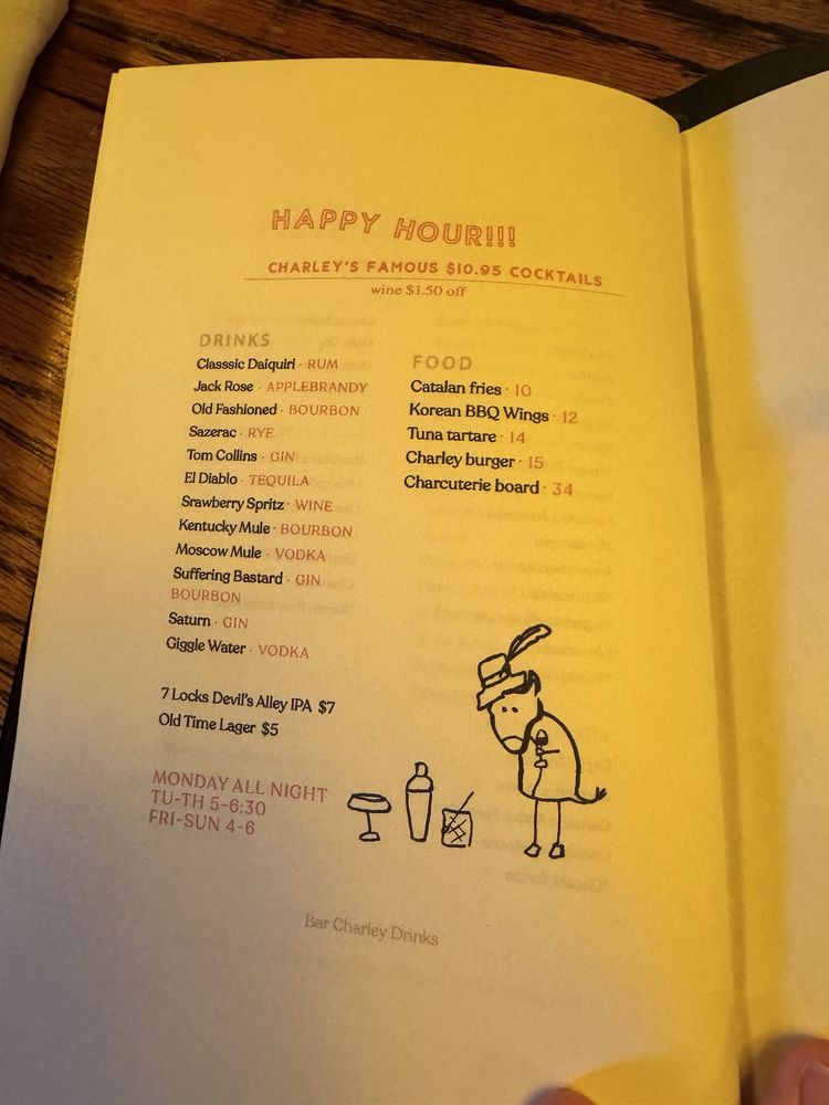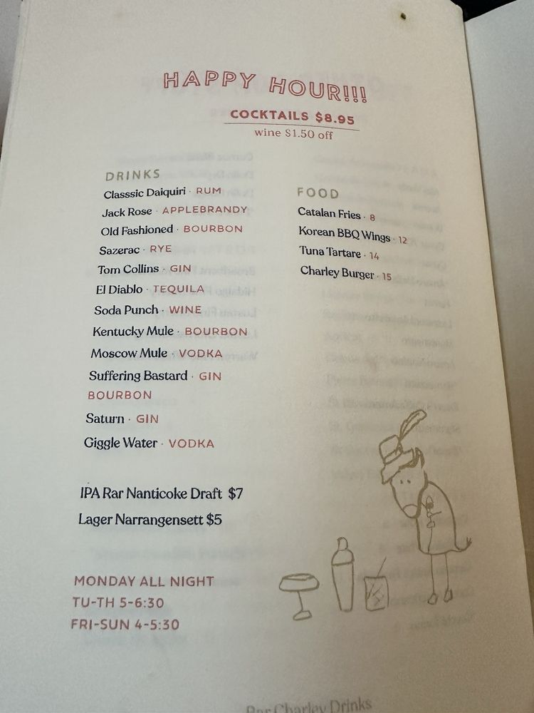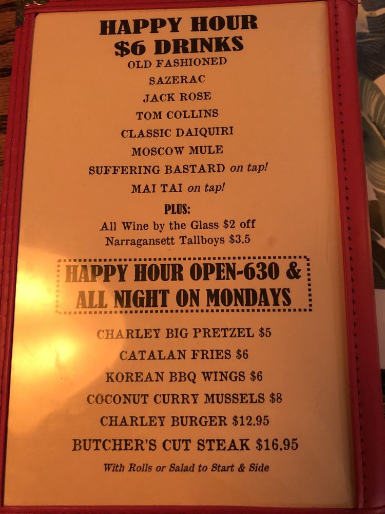 Bar Charley is a vibrant cocktail bar and eatery located in Washington, DC. Known for its diverse menu offerings, including creative appetizers like Goat Cheese Agnolotti and Cobia Crudo, as well as enticing entrees such as Citrus Duck Breast and Curry Eggplant. The restaurant also offers a variety of snacks like Marinated Olives and Grilled Artichokes. Customers praise the cozy speakeasy-like ambiance and friendly service at Bar Charley, making it a popular spot for both happy hour and weekend brunch. Signature cocktails like the Mai Tai and unique dishes like Crab Benedict are crowd favorites. Reservations are recommended for peak times, especially if you want to snag a spot on their charming outdoor patio. If you're seeking a lively and social dining experience with quality drinks and a unique setting, Bar Charley is the place to be.